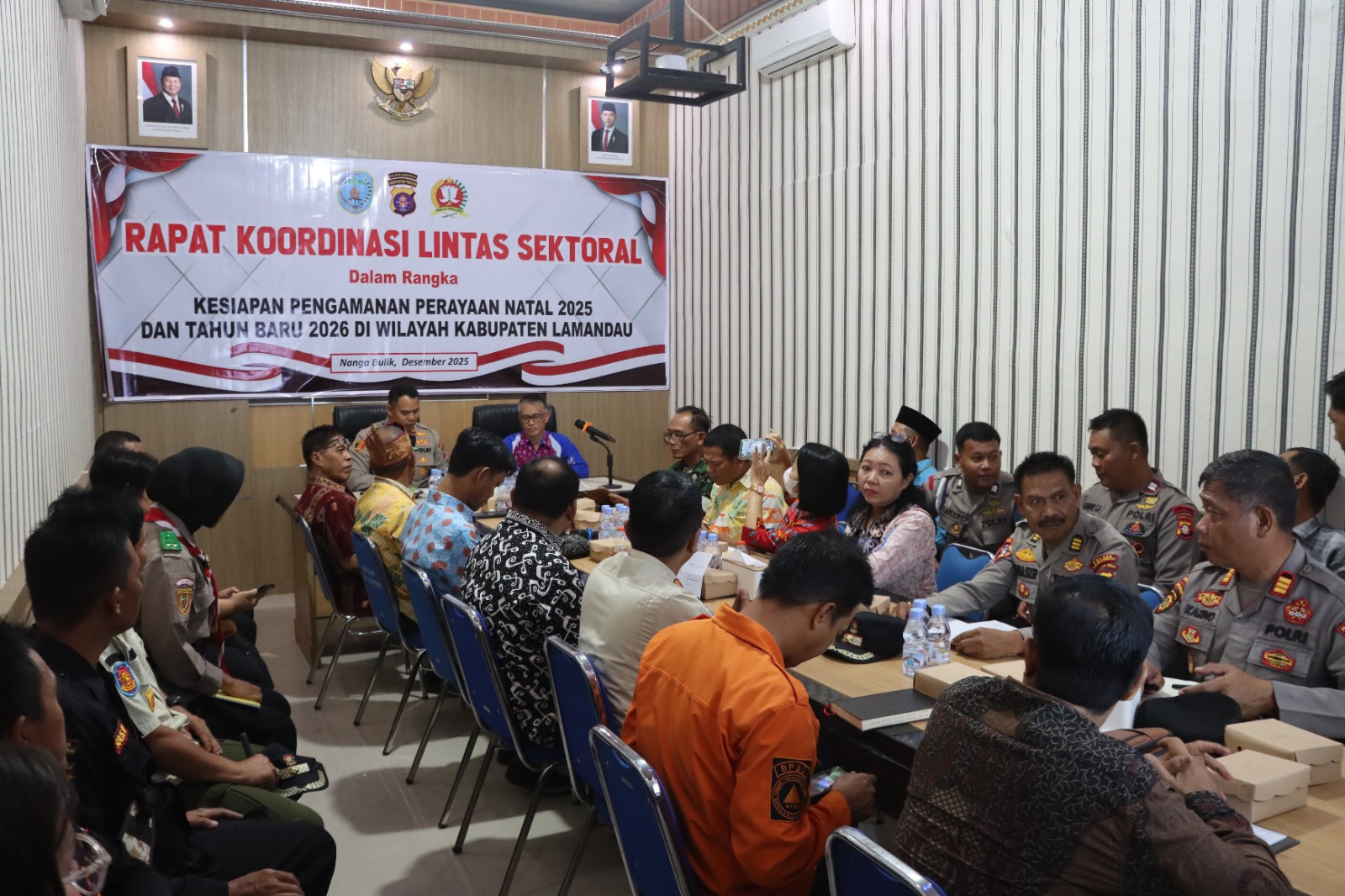 Rapat koordinasi ini dipimpin oleh Kapolres Lamandau AKBP Joko Handono, S.I.K., M.H.,M.M., dan dihadiri oleh unsur Forkopimda, TNI, pemerintah daerah, Dinas Perhubungan, Dinas Kesehatan, Satpol PP, BPBD, pengelola tempat ibadah, serta instansi terkait lainnya. Kegiatan ini bertujuan untuk menyatukan persepsi dan memperkuat sinergi antarinstansi dalam menjaga keamanan dan ketertiban masyarakat selama rangkaian perayaan Nataru.