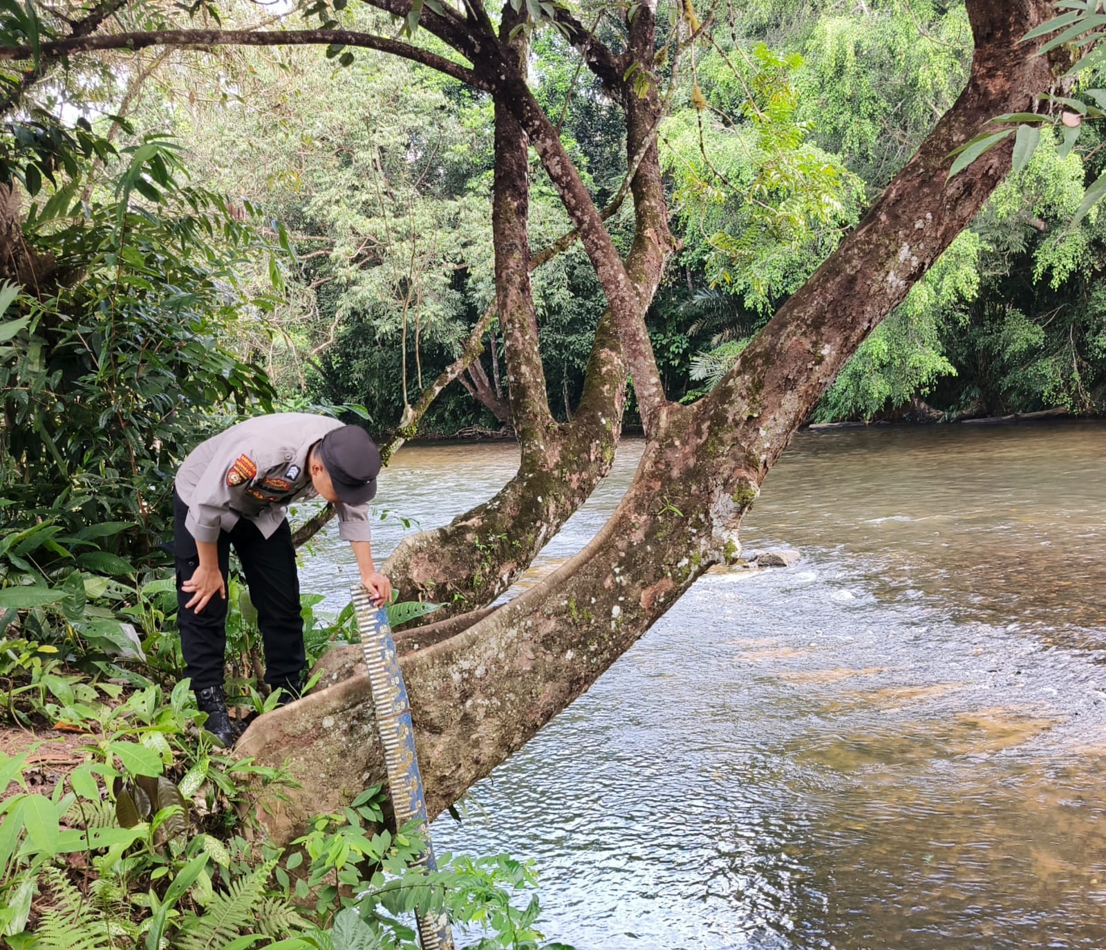 Lamandau – Polsek Delang, Piket Polsek Delang melakukan kegiatan rutin pengecekan debit air DAS Delang di TMA Kelurahan Kudangan RT.02 Kecamatan Delang, Selasa (23/12/25) Pagi